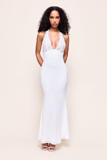 - The Lillia Dress is evening elegance distilled—crafted in fluid black with a daring lace halter plunge that drapes into an open back. A floor-length silhouette skims the body, balancing romantic lace with a sultry, minimal frame.