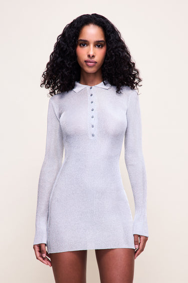 • The Lilou Dress is crafted from a lightweight ribbed knit with a soft stretch that contours the body while remaining breathable. Designed with a subtle collar, partial button placket, and long sleeves with slight flare cuffs, it blends relaxed tailoring with a sultry, body-skimming silhouette. The semi-sheer finish adds dimension and edge, making it perfect for layering over your favorite essentials or styling boldly on its own. A modern mini that transitions seamlessly from day to night.