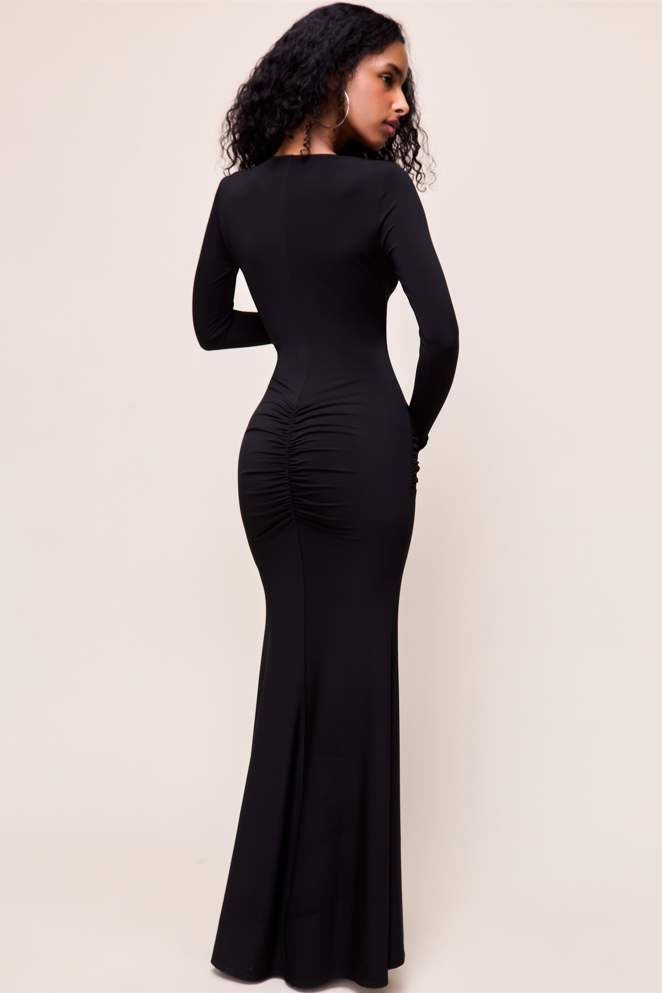 • Sleek and statement-making, the Liora Long Sleeve Dress is designed to contour the body in all the right places. Featuring a plunging neckline with a subtle front cutout and silver-tone ring detail, it creates a bold yet refined focal point. Soft ruching at the hips with a coordinating ring accent enhances the silhouette, while the long sleeves and maxi length balance the look with effortless elegance. Perfect for evenings when you want to command attention with minimal effort.