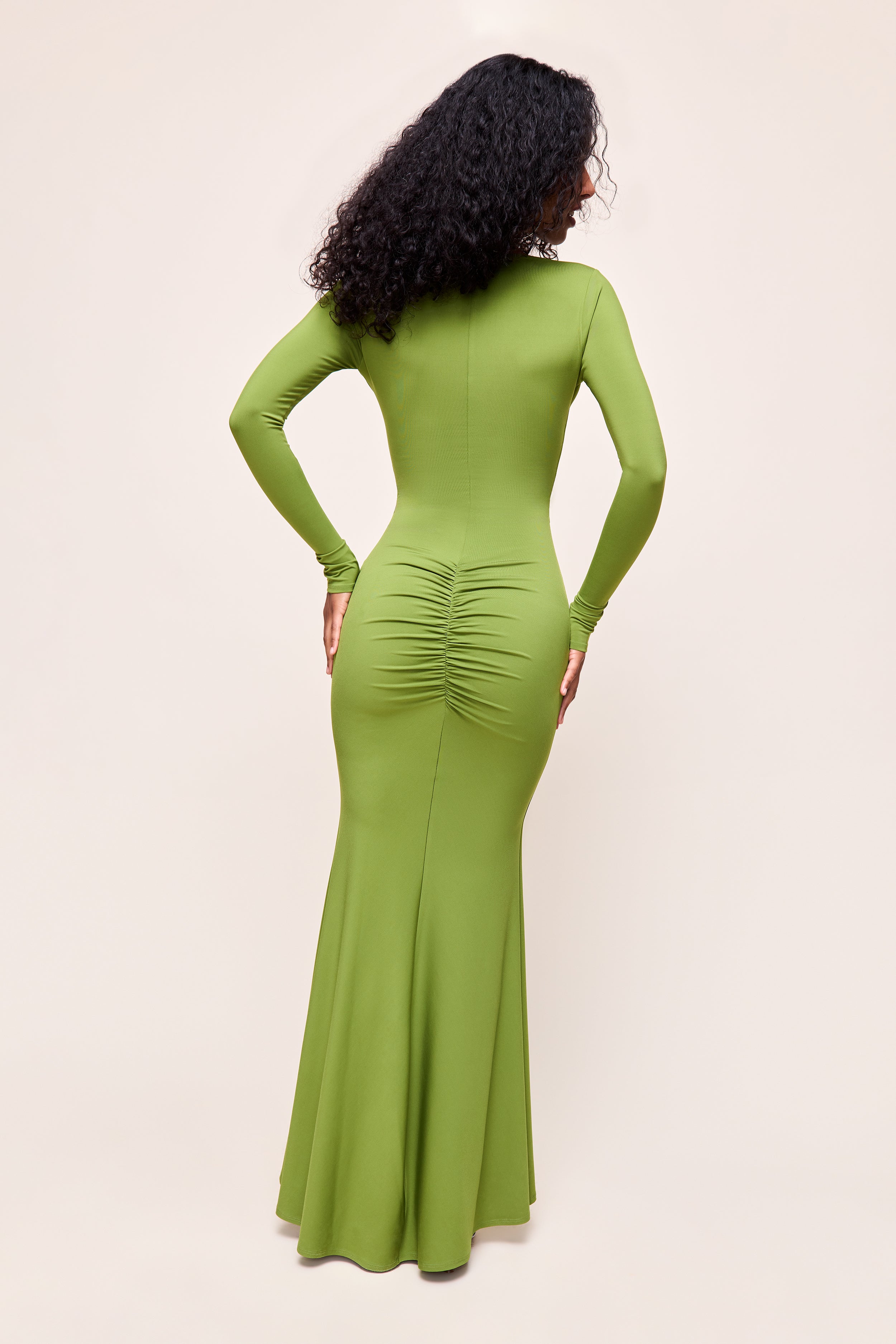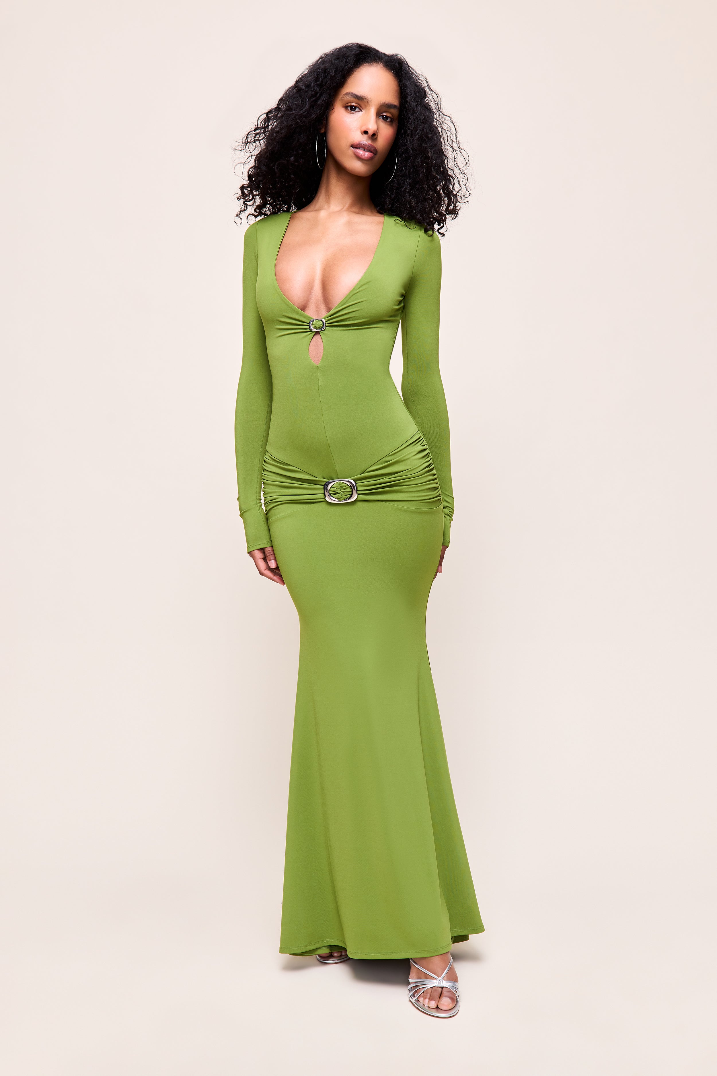 - Sleek and statement-making, the Liora Long Sleeve Dress is designed to contour the body in all the right places. Featuring a plunging neckline with a subtle front cutout and silver-tone ring detail, it creates a bold yet refined focal point. Soft ruching at the hips with a coordinating ring accent enhances the silhouette, while the long sleeves and maxi length balance the look with effortless elegance. Perfect for evenings when you want to command attention with minimal effort.