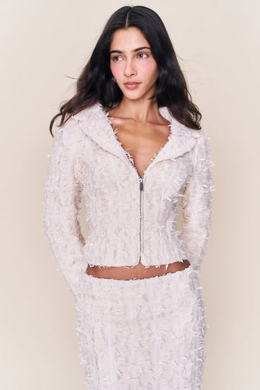 - The Lillian Fitted Blazer is crafted from a textured cream tweed with soft, eyelash fringe detailing throughout. Designed to contour the waist, it features a structured shoulder, a sharp collared neckline, and a clean zip-front closure. The cropped length and subtle shimmer woven into the fabric create a feminine, modern take on classic suiting—perfect on its own or paired with the matching Lillian Pencil Skirt.