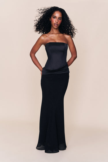 • A strapless satin corset meets a flowing chiffon maxi skirt. The Scarlett Maxi Dress is detailed with internal boning, a lace-up back, and a soft draped waistband that accentuates the waist.