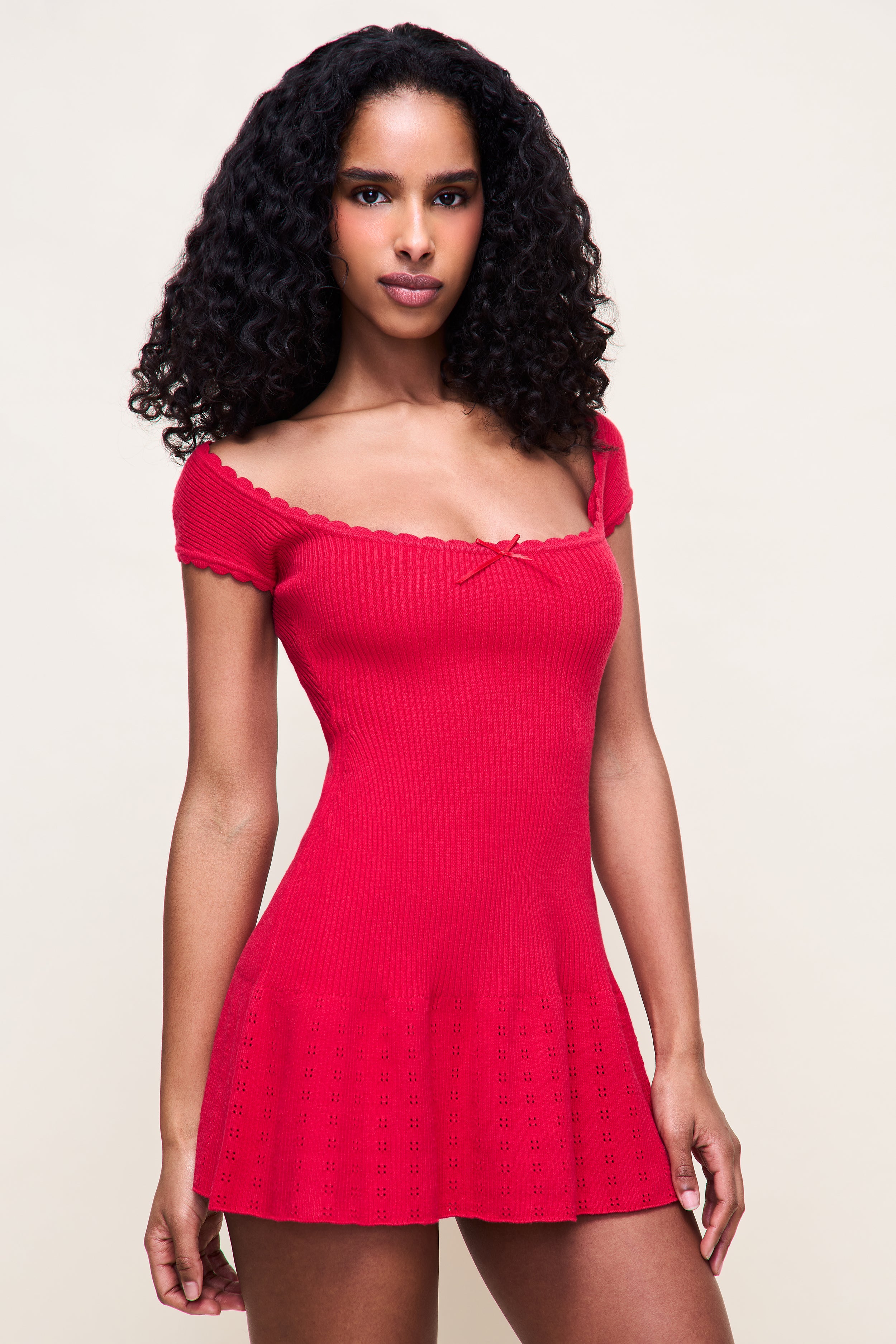 - The Eileen Pointelle Dress is a soft, feminine mini designed to flatter from every angle. Crafted in a delicate pointelle knit, this style features a wide, scalloped neckline with cap sleeves, a fitted bodice, and a gently flared skirt that moves with ease. Finished with a subtle bow detail at the bust, Eileen balances sweetness with a clean, sculpted silhouette.