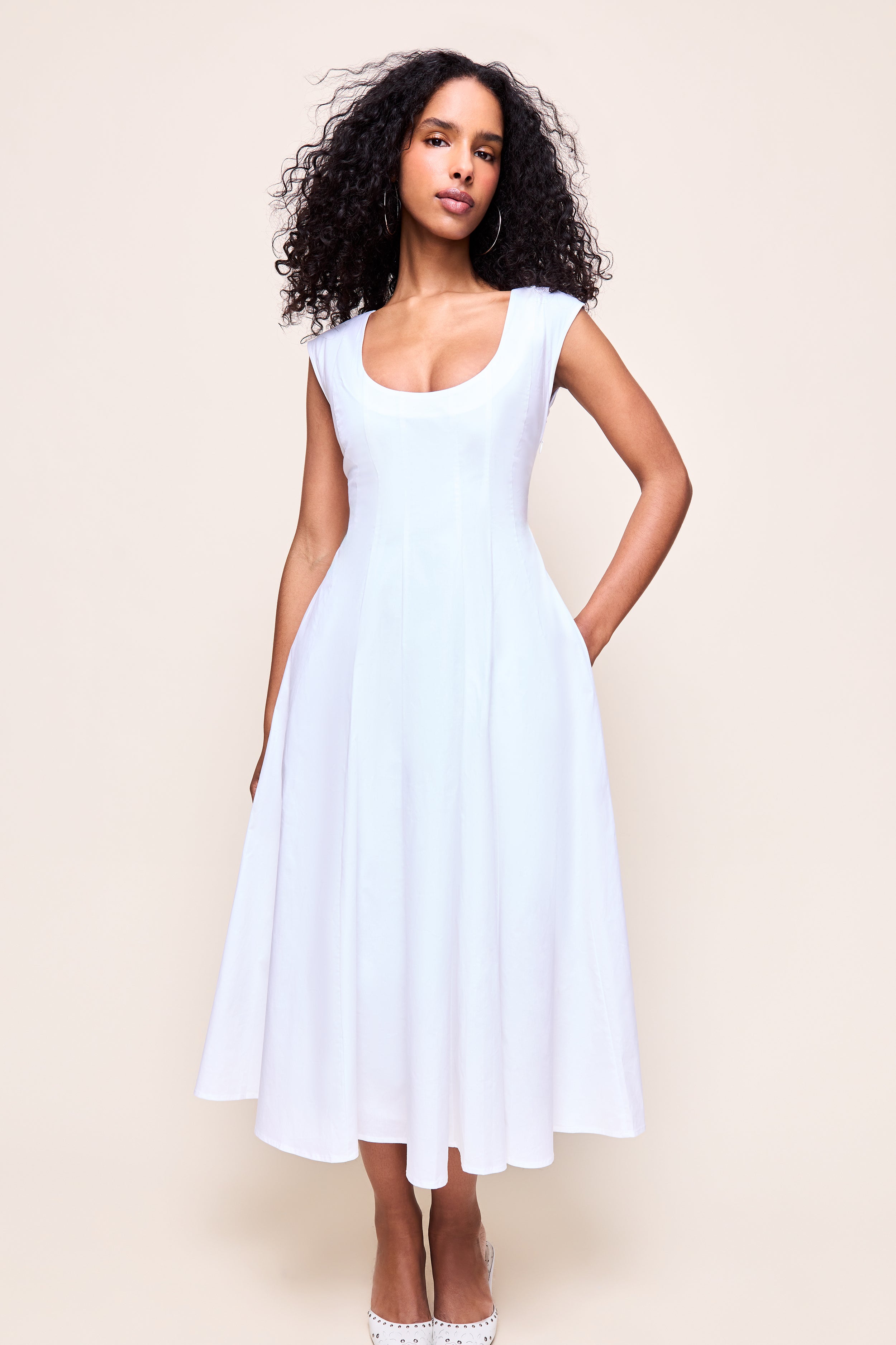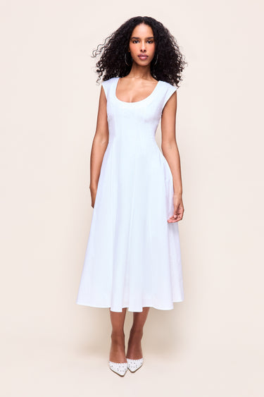 - Our iconic Leila Dress crafted in crisp cotton poplin that holds its shape while remaining light and breathable. Designed with a flattering scoop neckline and cap sleeves, it gently contours through the bodice before falling into a softly flared midi skirt for graceful movement.