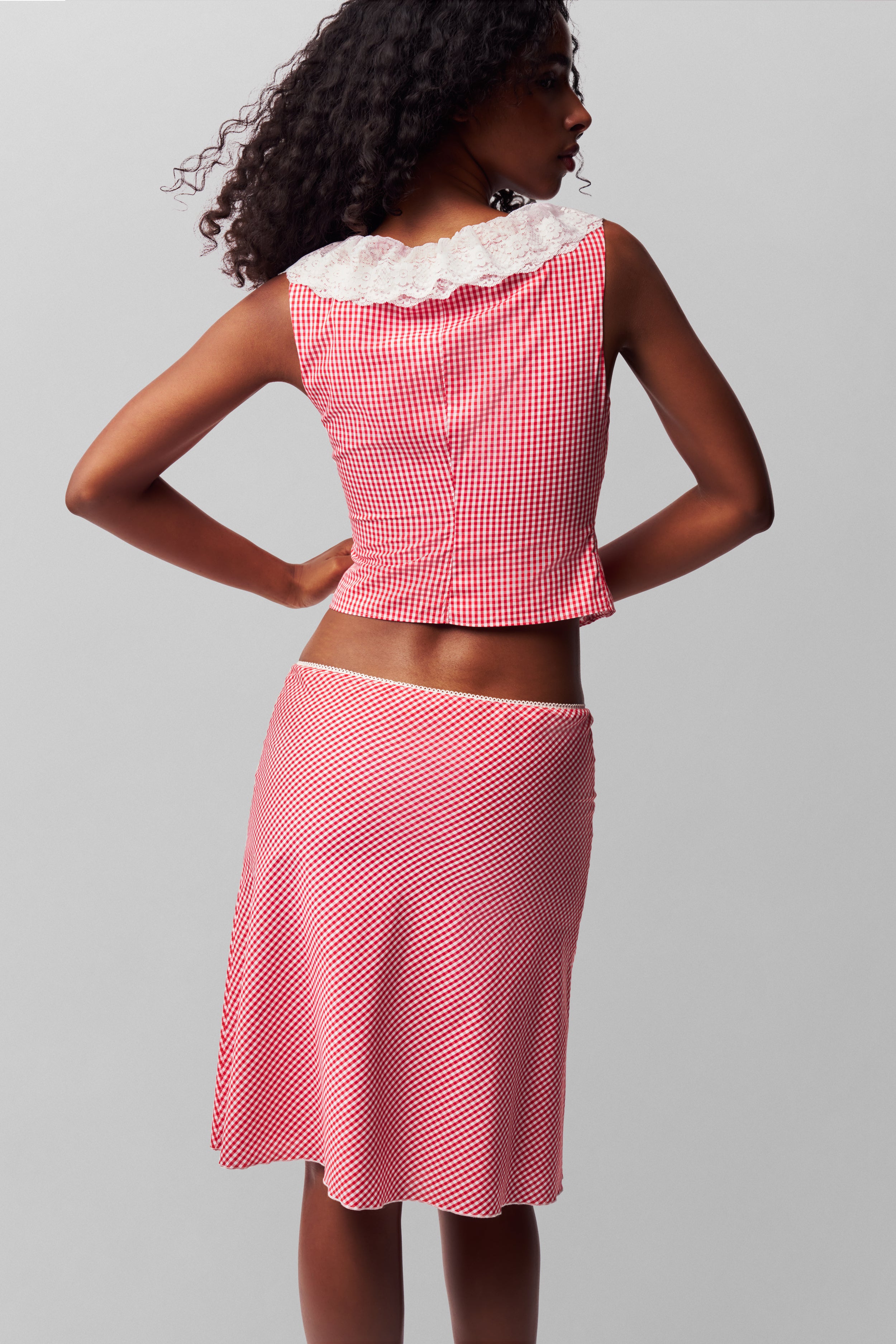 Eileen is wearing a size S and is 5'9" with a 32" bust, 35" hips, and 25.5" waist