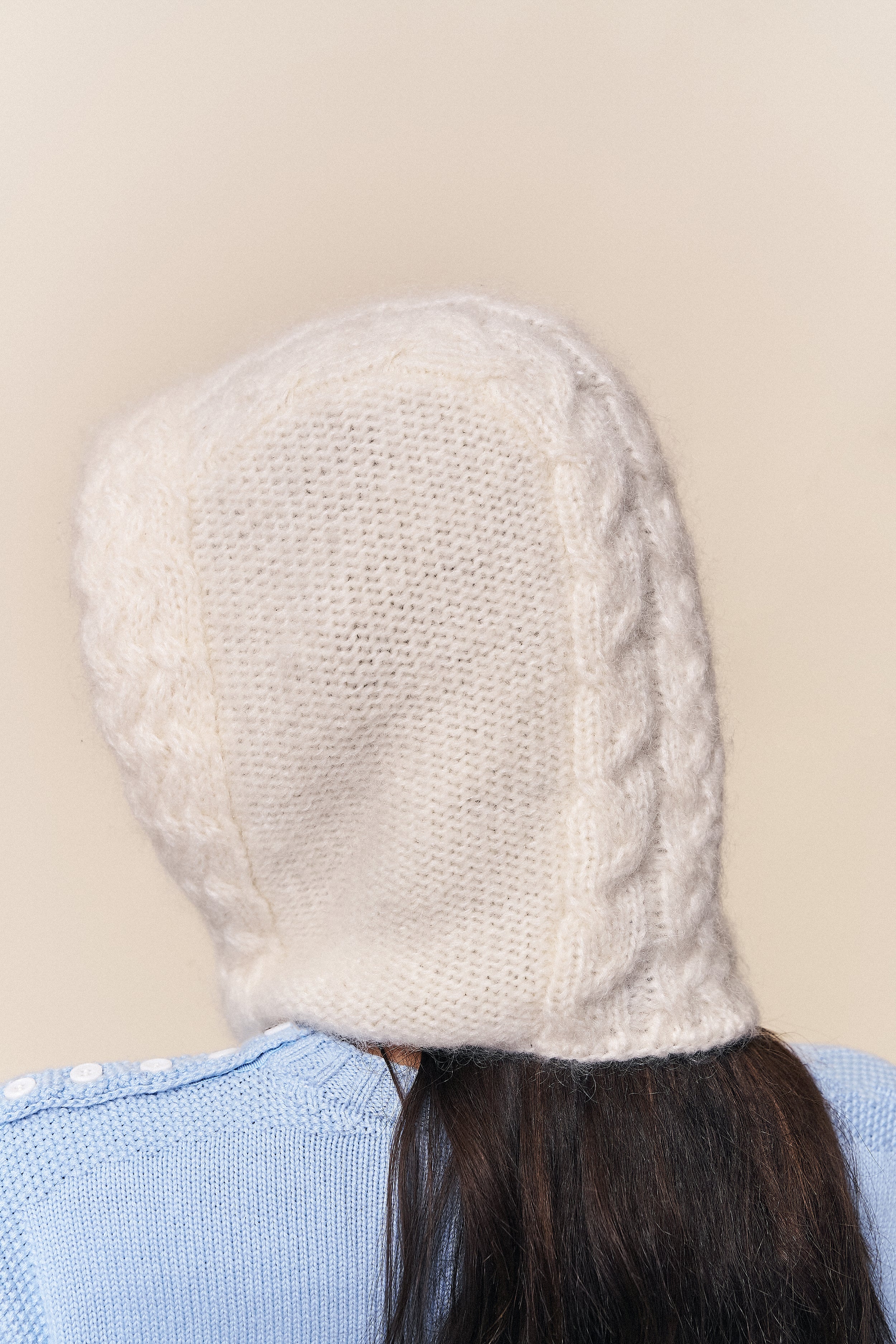 - A cloud-soft cable-knit hood with braided ties and a cozy, face-framing fit. Cold-weather comfort, elevated.